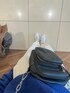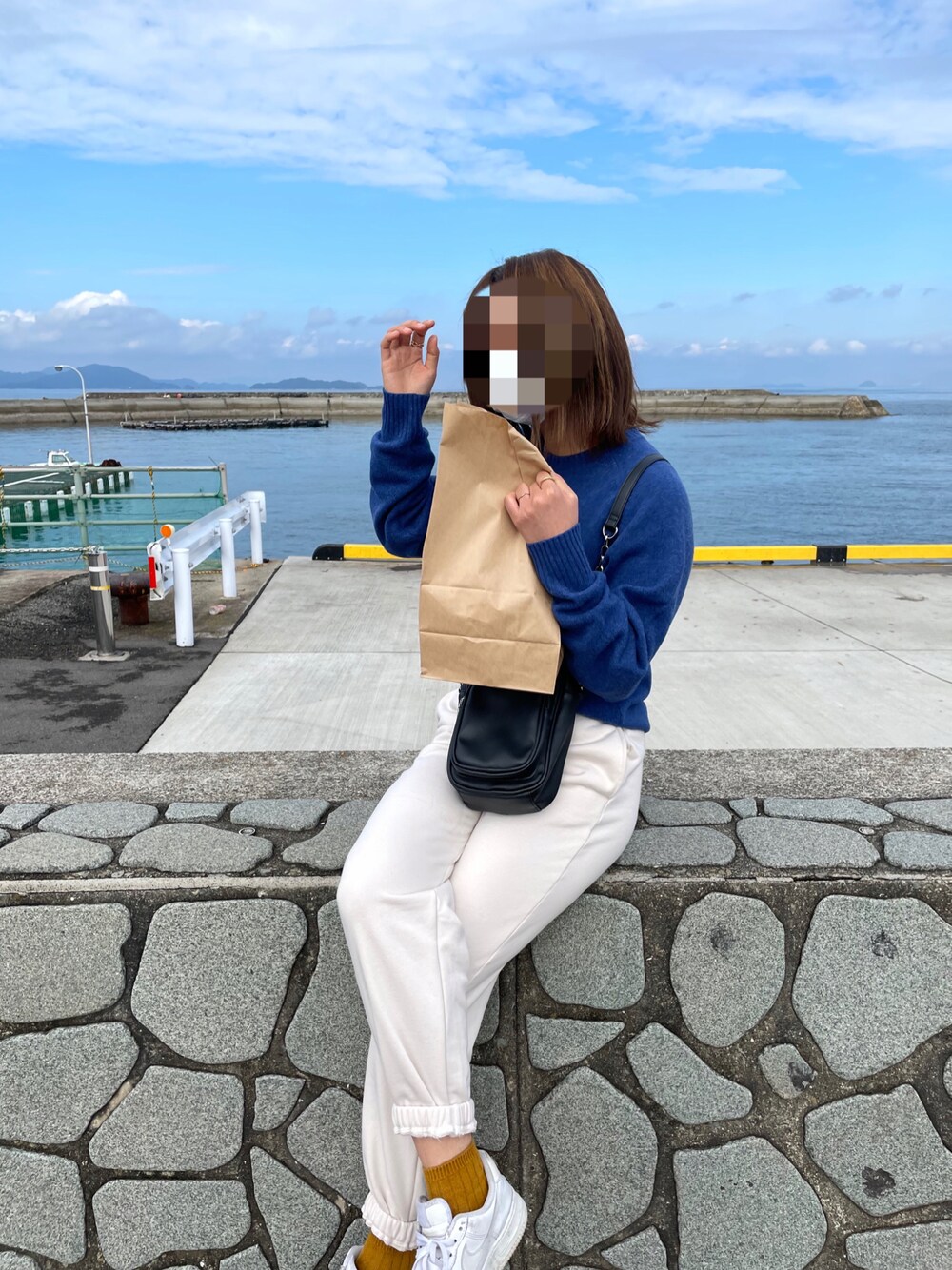 ブルー系のニット/セーター、ホワイト系のスウェットパンツを着用したレディースの秋コーディネートの2枚目の写真
