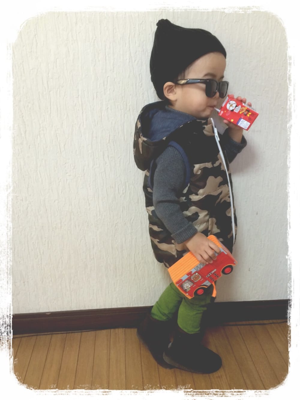 伊達眼鏡かけようとしたら今日はサングラスの気分だったらしく知らぬ間にかけてました(´ψψ`●)笑 トミカLOVEな彼ですがまだアンパンマンも好きみたいです★