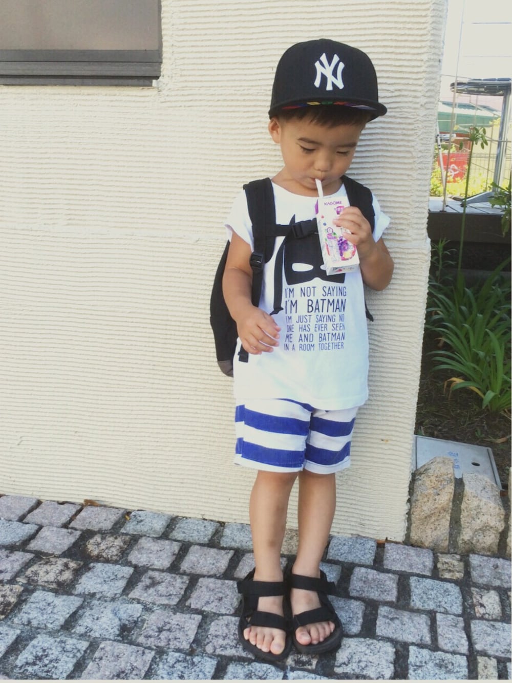 ブラック系のバックパック/リュック、ホワイト系のTシャツ/カットソー、ブラック系のキャップを着用したキッズの夏コーディネートの1枚目の写真