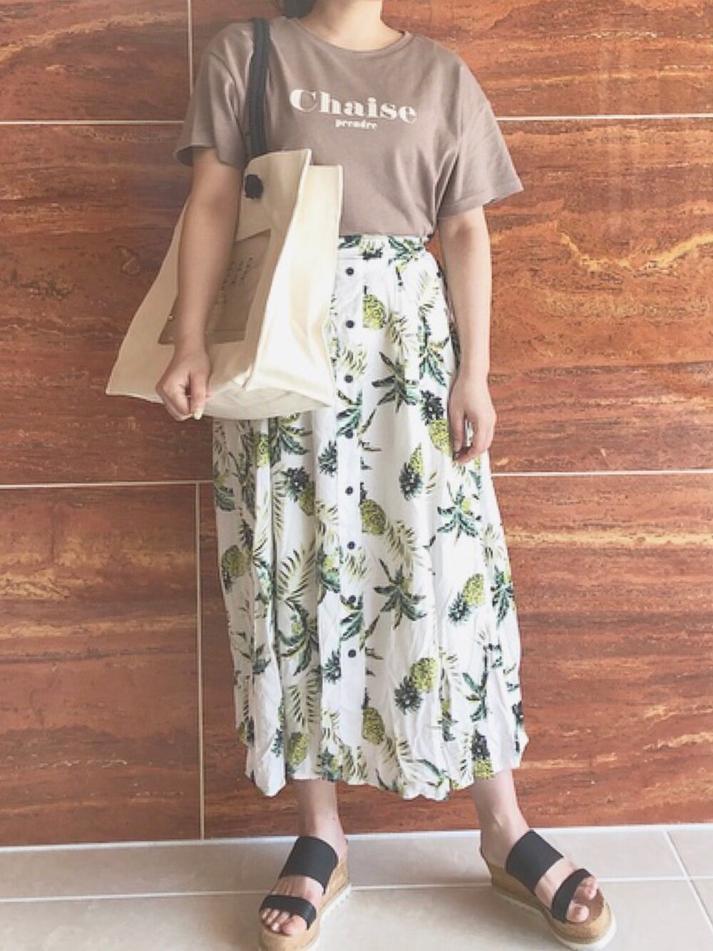 aimiiのスカート「パイナップル柄ミモレ丈フレアスカート*レディース/ボトムス/ミディアム丈[M2227]神戸レタス」を使ったコーディネート