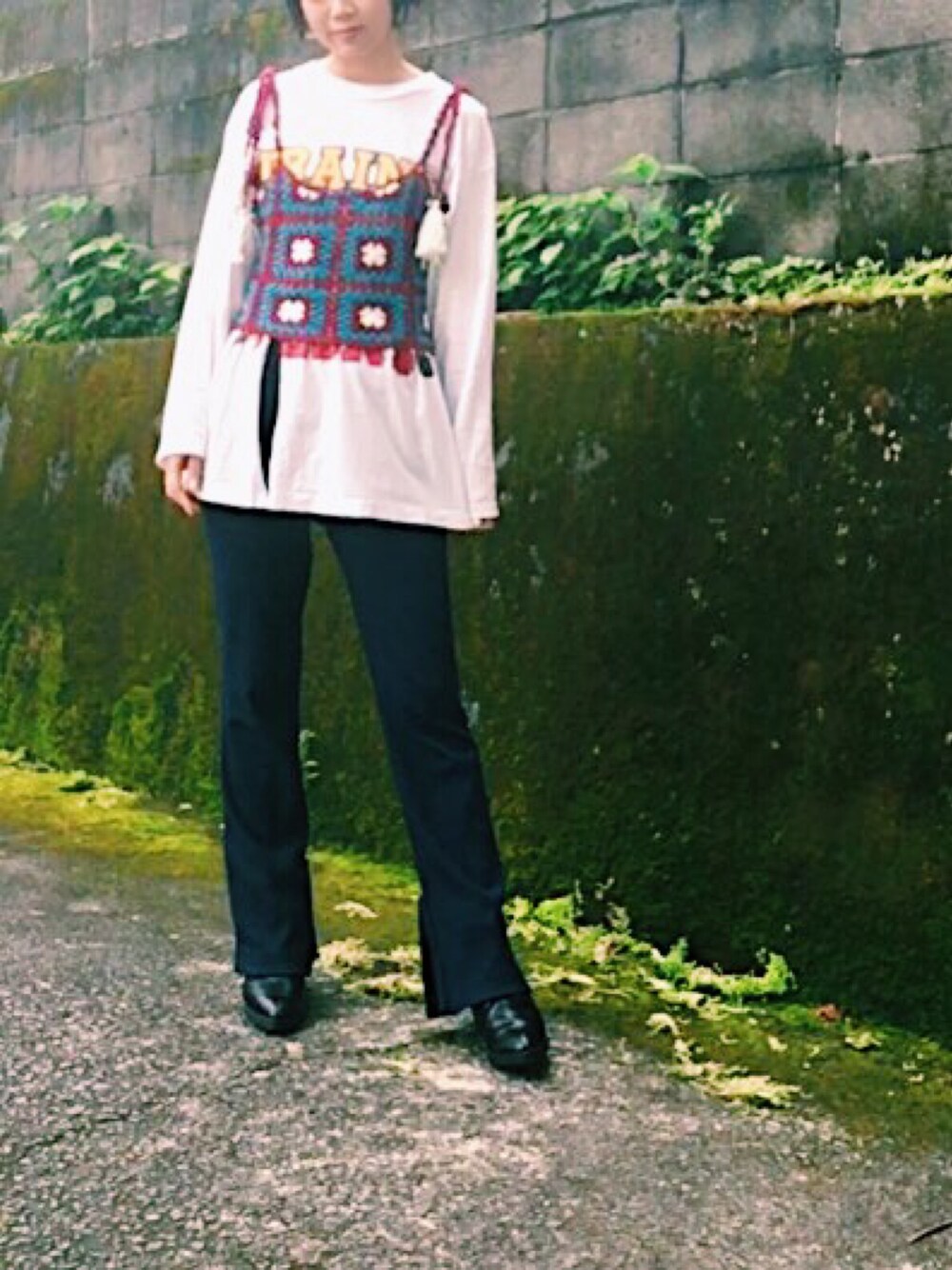 カギアミビスチェはゆったりとしたサイズ感なので、インナーを選びません☺︎ ロンTもゆったりめを持ってきたので、リブフレアパンツで引き締めました。 個性を出したかったので、あえてここはスキニーではなく、トレンドのリブフレアパンツで。 いつも見ていただきありがとうございます🌴 instagramは@_aimine_