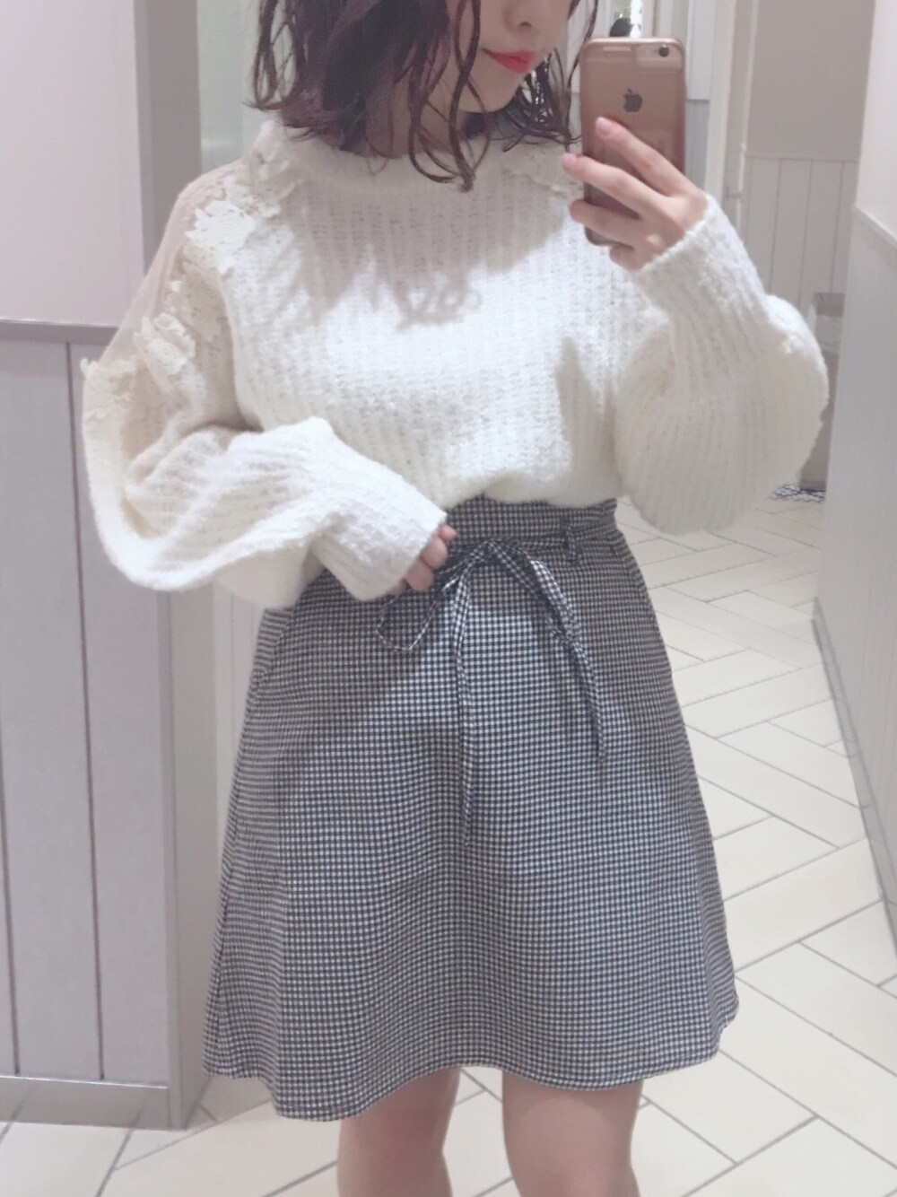 肩の透けレースがpoint💞 ギンガムチェックのスカートで とことんガーリーに着てみました❤︎ クリスマスデートにもおすすめ😍