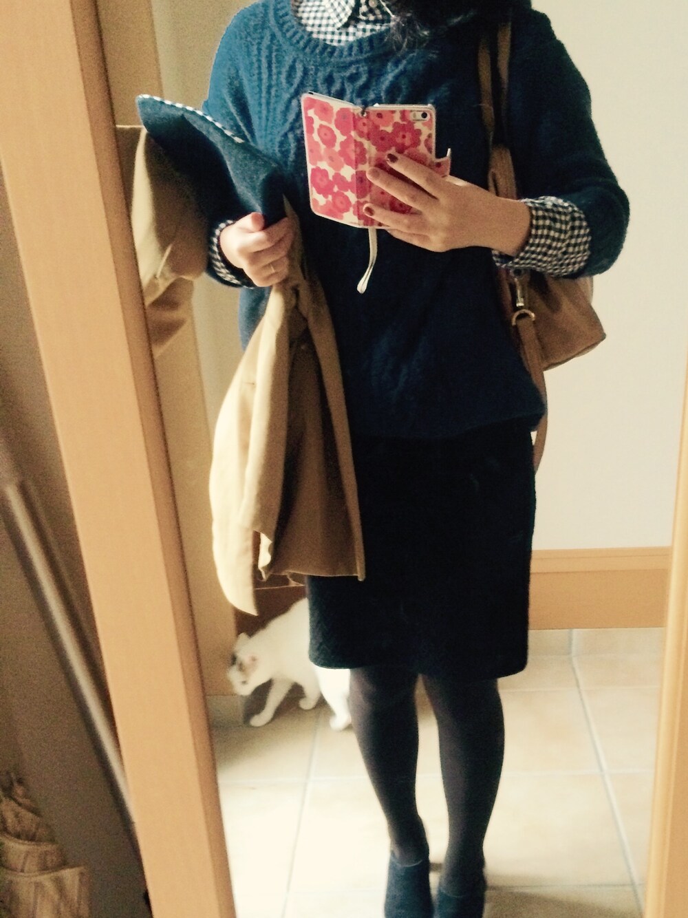 シャツ:UNIQLO タイツ(ダークブラウン):無印良品 ブーティ:横浜そごうで購入 ネコが写り込んでる(・_・; 寝坊してとっさに選んだ適当コーデです。いつも適当ですけど、今日は一段と適当です。笑