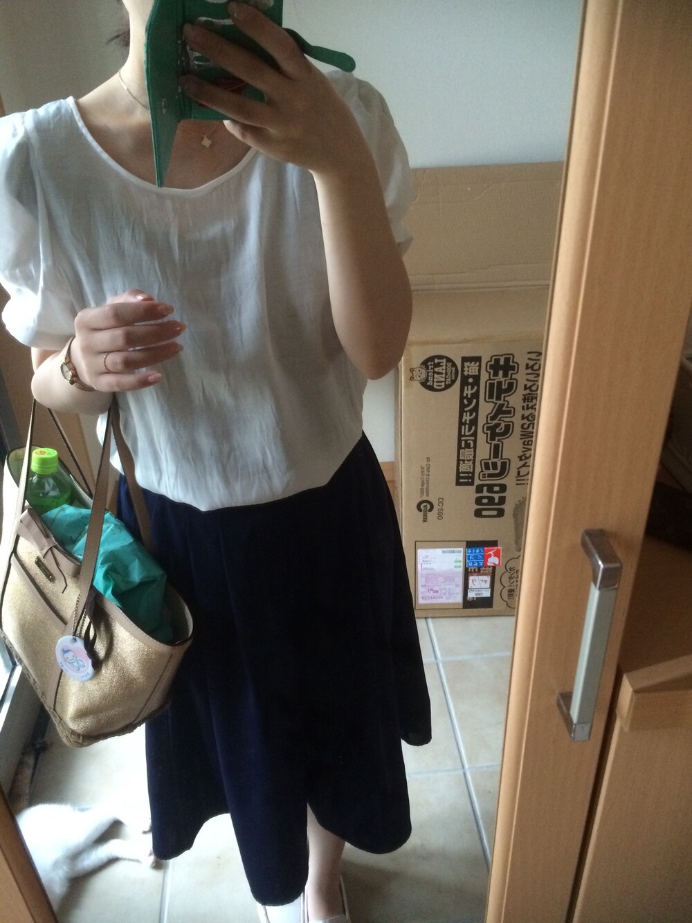 背後にダンボールが(笑)毎日似たような格好ですが、、蒸し暑いので涼しげコーデ(^ ^) GUのガウチョが妊婦でも履きやすいのでもう一着色違いを買い足したいです( ^ω^ )