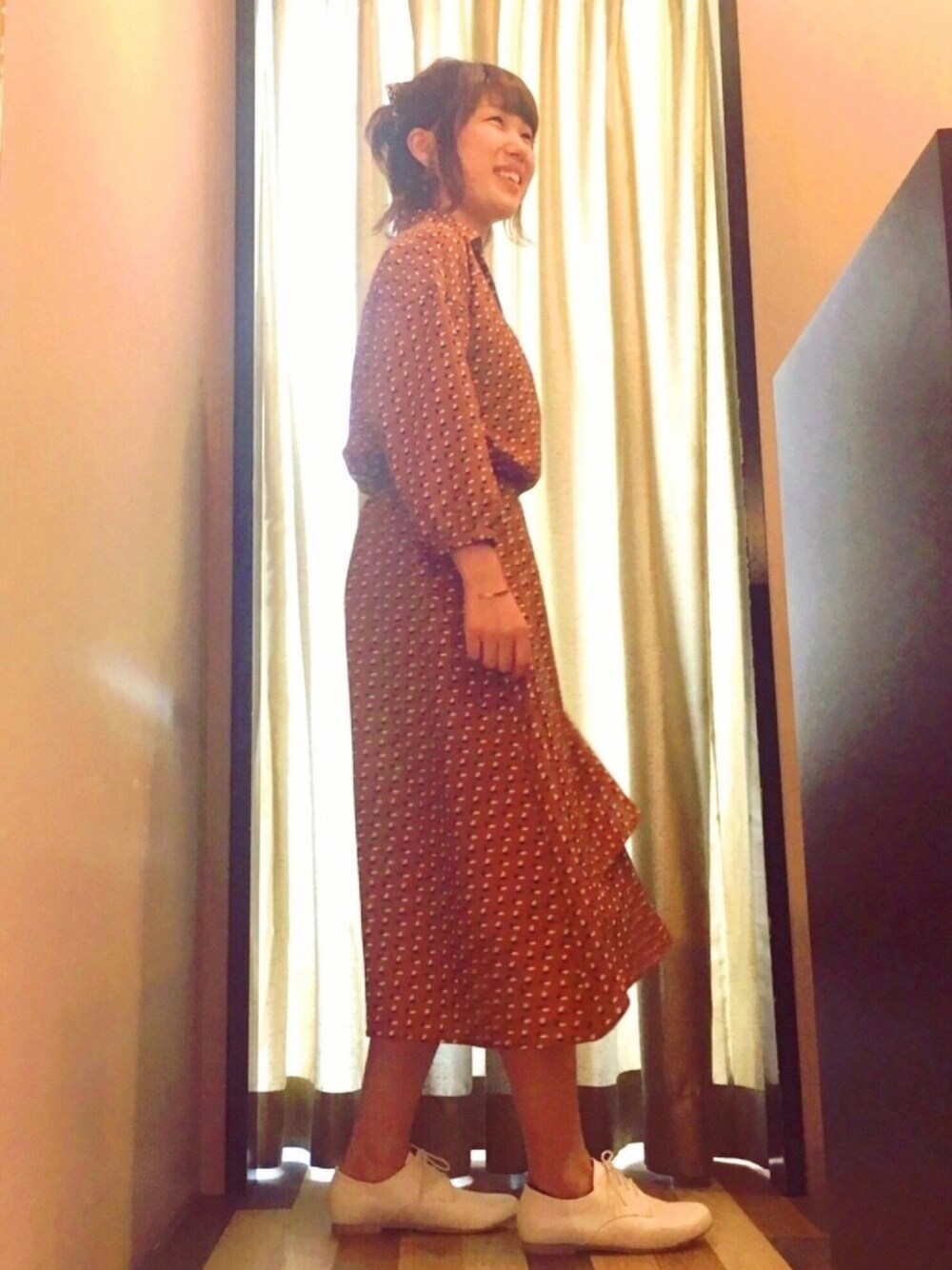 レトロな雰囲気の小紋柄ワンピース イレギュラーなヘムラインは 動きに合わせていろいろな表情が楽しめます 足元はレースアップシューズで カジュアルに♪