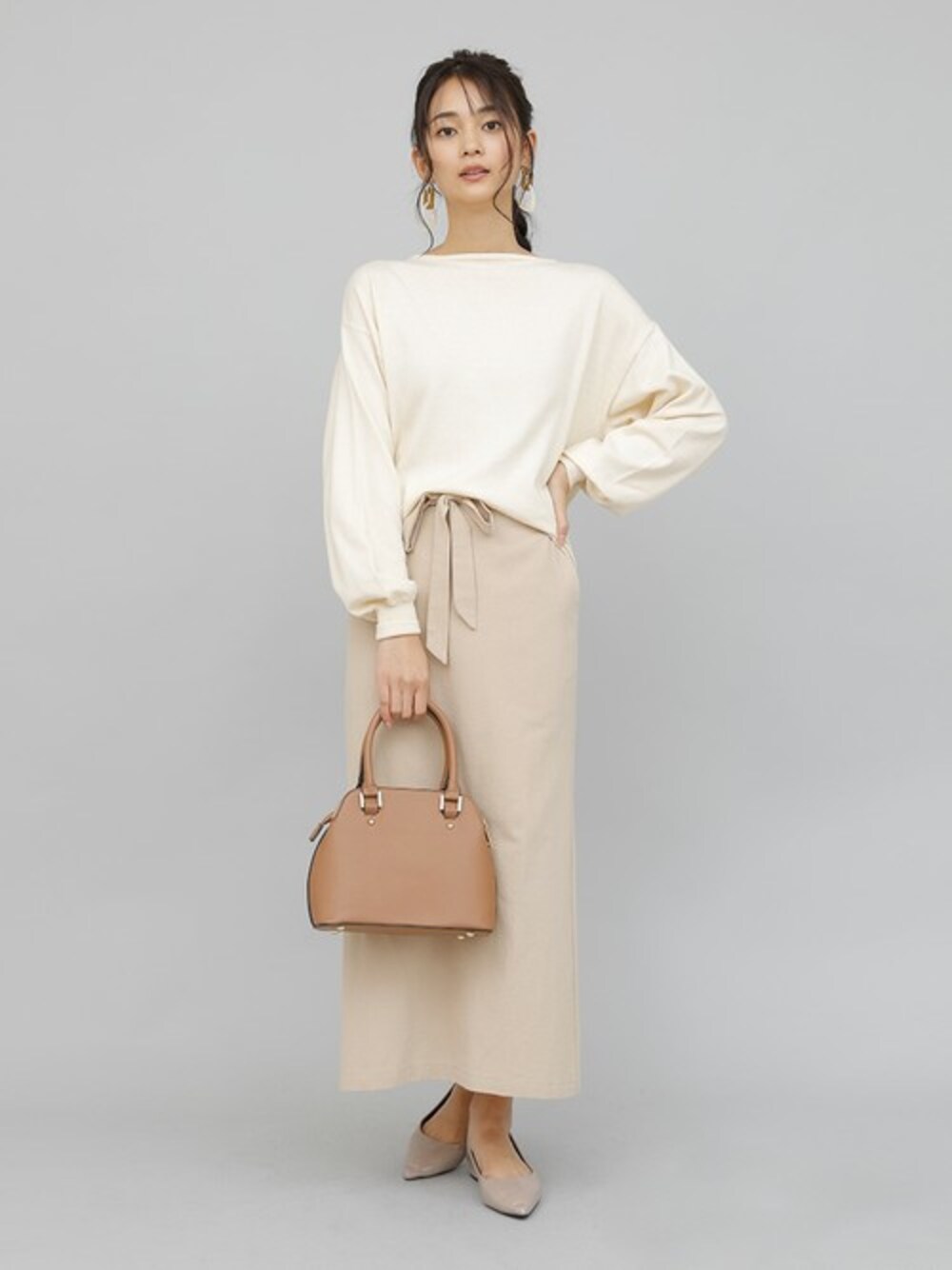 見た目は一見ベーシックなトップス、後に振り向くとなんとも女性らしい捻りスタイリング。 スカートにブラウジングするなど、着こなし方は幅広く今シーズン見逃せないトップスです。