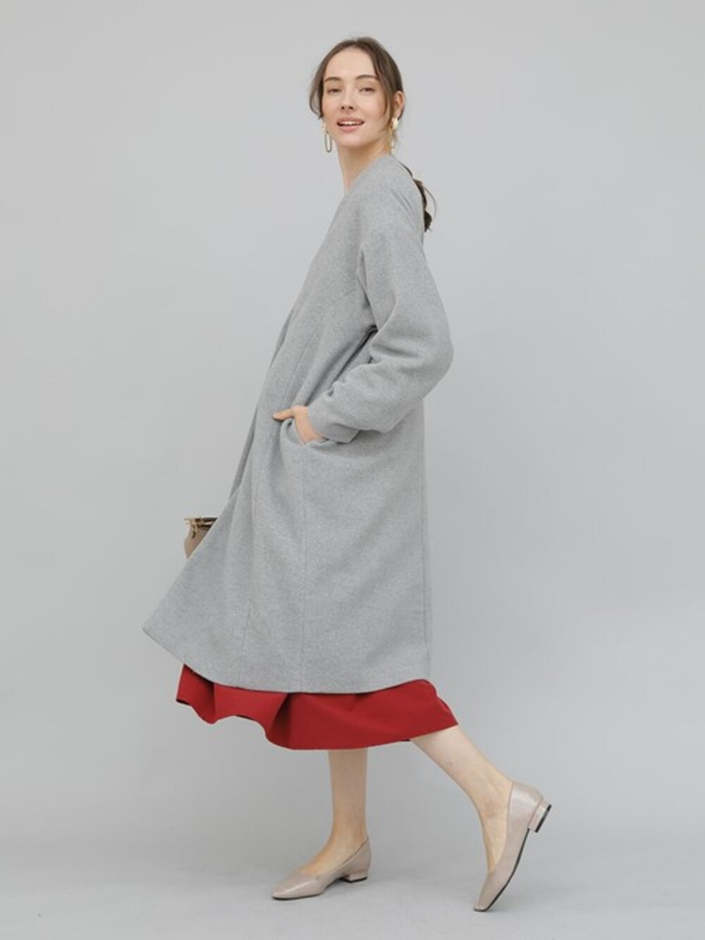 ふんわり起毛素材で仕立てたノーカラーロングコート。 肌触りが滑らかで上品のシンプルデザインが大人女性らしい。 普段使いも、結婚式や二次会などのお祝い事でもドレスにぴったし合う万能コート。