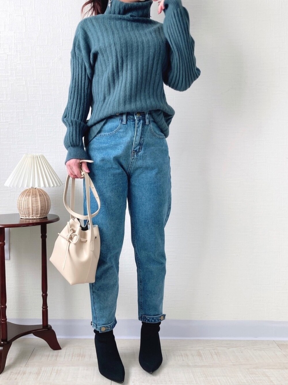 くすみブルーのハイネックニットとデニムコーデ 身長 158cm