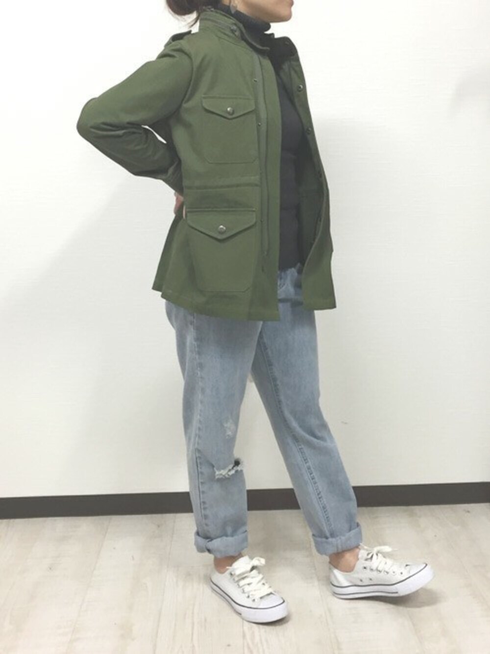 メンズライクなデニムパンツとミリタリージャケットの定番コーデ。 ハイライズなので、トップスをインしてもカワイイデニムです。