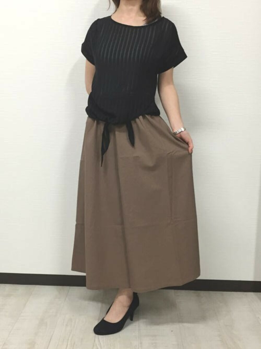 ウエストリボンがポイントのシースループルオーバーとリネンフレアスカートのコーデ。 透け感が程よく、女子力アップできます!!
