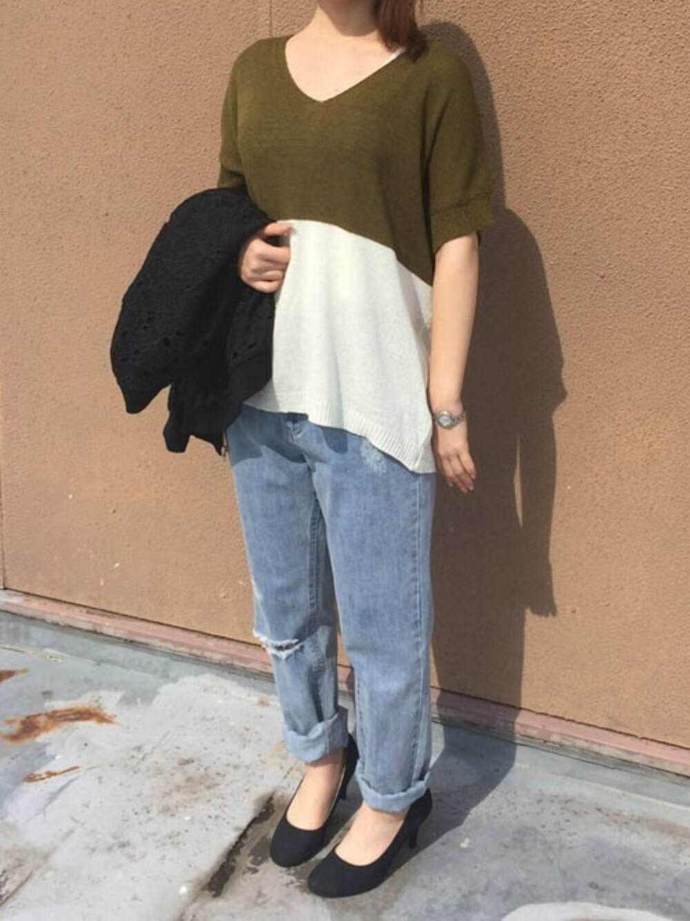 カーキとホワイトのバイカラーサマーニットです。 さらっとゆるっと着れてラクチン! どんなボトムスにも合わせやすいです。