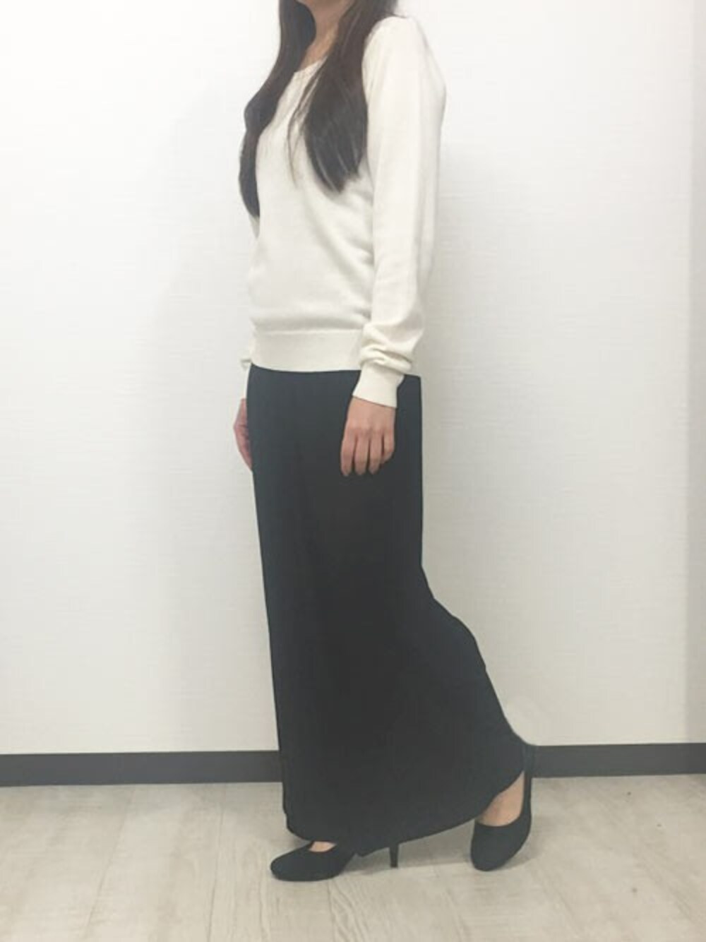 プリーツのガウチョパンツをシックに。 シンプルなホワイトのニットと合わせるだけで大人っぽくまとまります。