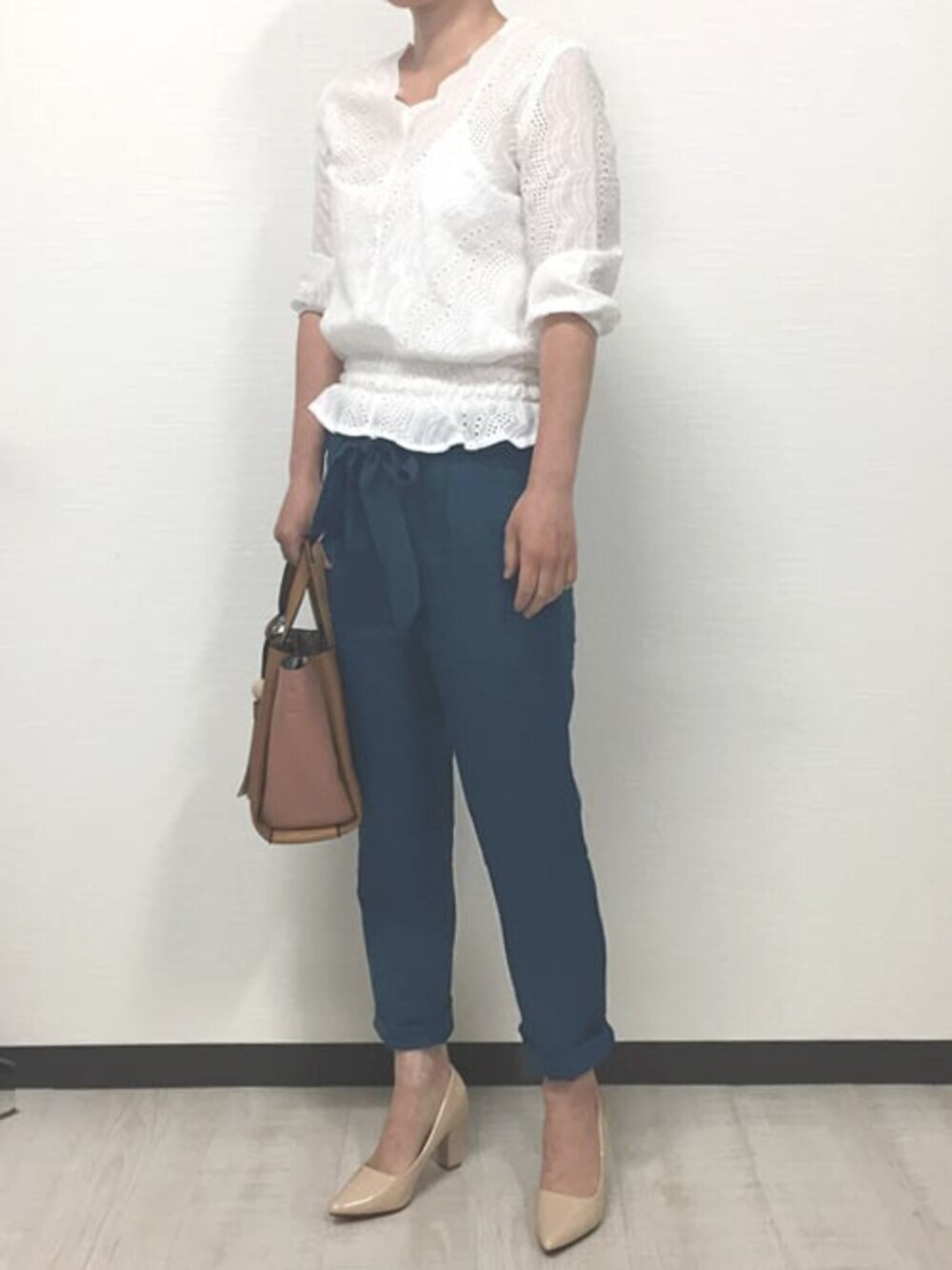 ウエストリボンのリネンパンツとレーストップスの大人女子コーデです。 リネンのパンツはサラリとしては着心地もよく涼しく過ごせるので春夏におすすめ!