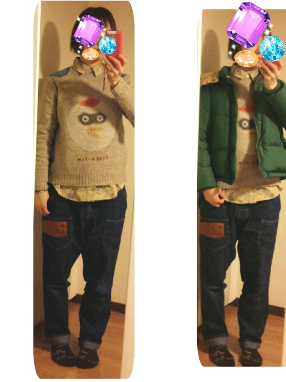シャツとダウンの柄一緒。 あーあ。眠い眠い。