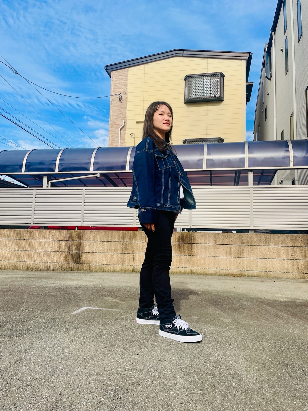 GU×rokhのデニムジャケットです 特徴的なデザインで気に入っています ボタンは基本開けて着るのですがこのジャケットは閉めたほうがスタイルがキマる気もして迷ってます😅 足元は最近購入したvansのharfcabです