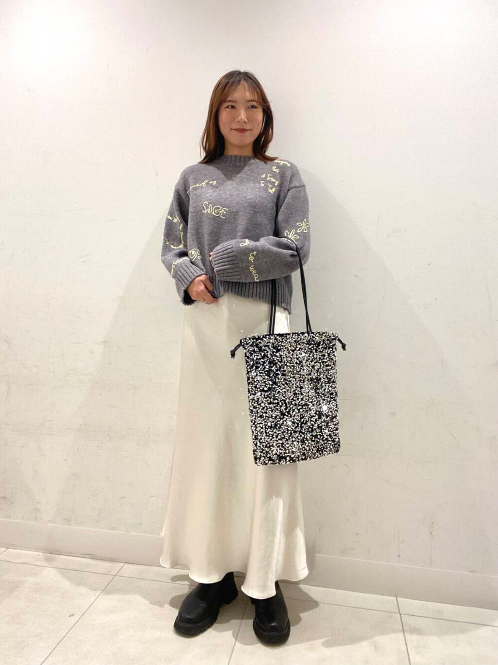 流行りのシシュウの入ったニットにサテンスカートを合わせてみました! シンプルですが間違いなしのコーデ◎ スカートは光沢感があって動くたびかわいいです!