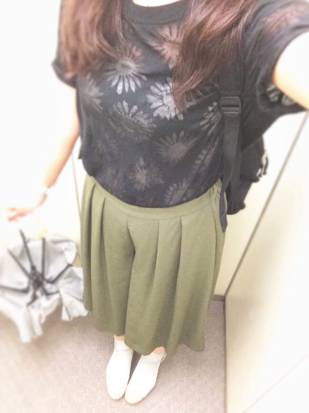 欲しくて買ってしまったカーキのガウチョ。👼 トップスはセールで数百円で購入👏 急に雨降ったから傘もってます