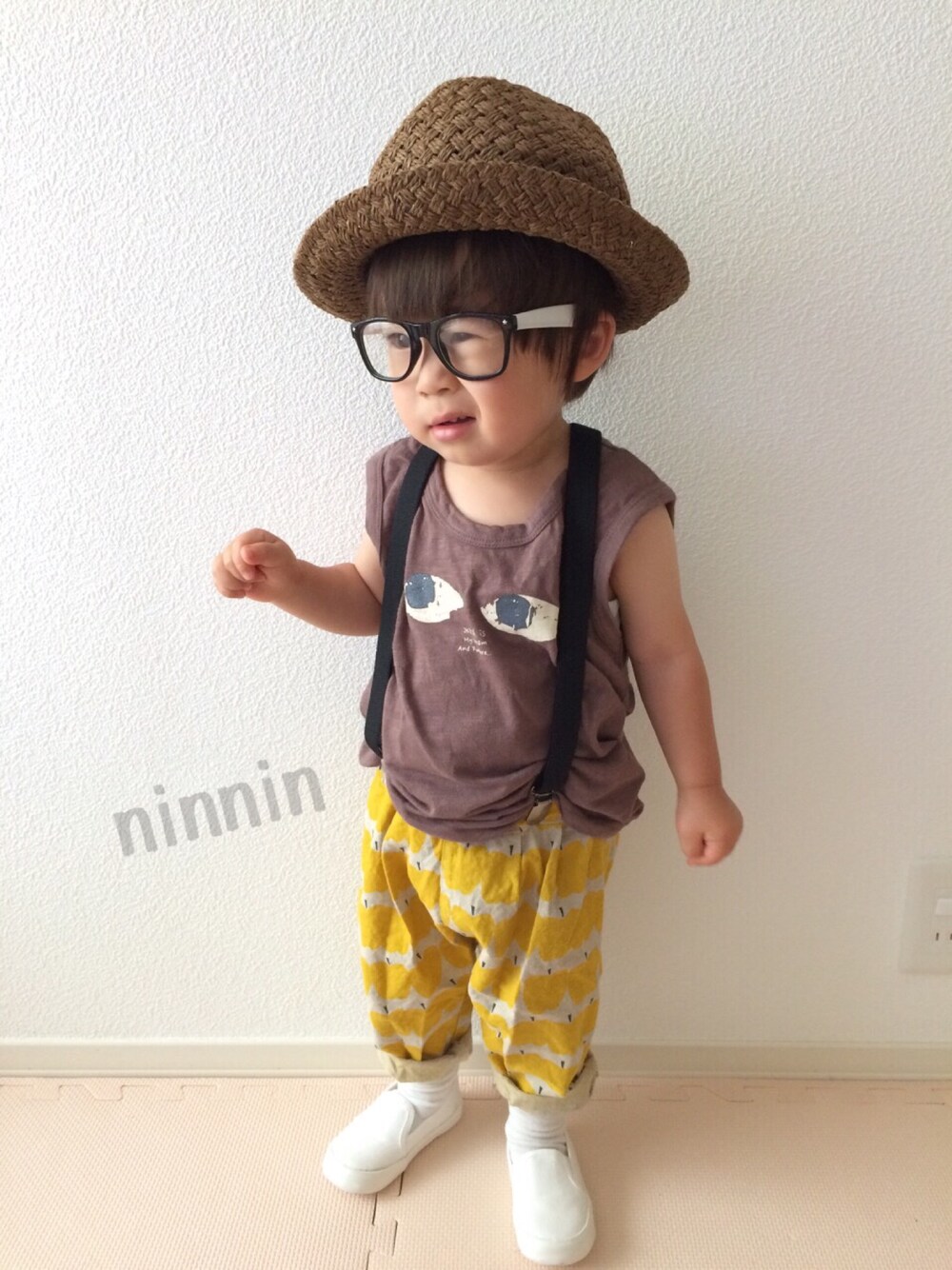 ちゃんしーちゃんに教えていただいたダイソーのサスペンダーを KOZOくんのコーデにインスパイアされ といったコーデです。 ウィンク?ウインク?してます。 ついでに昨日の七夕おじコーデも。