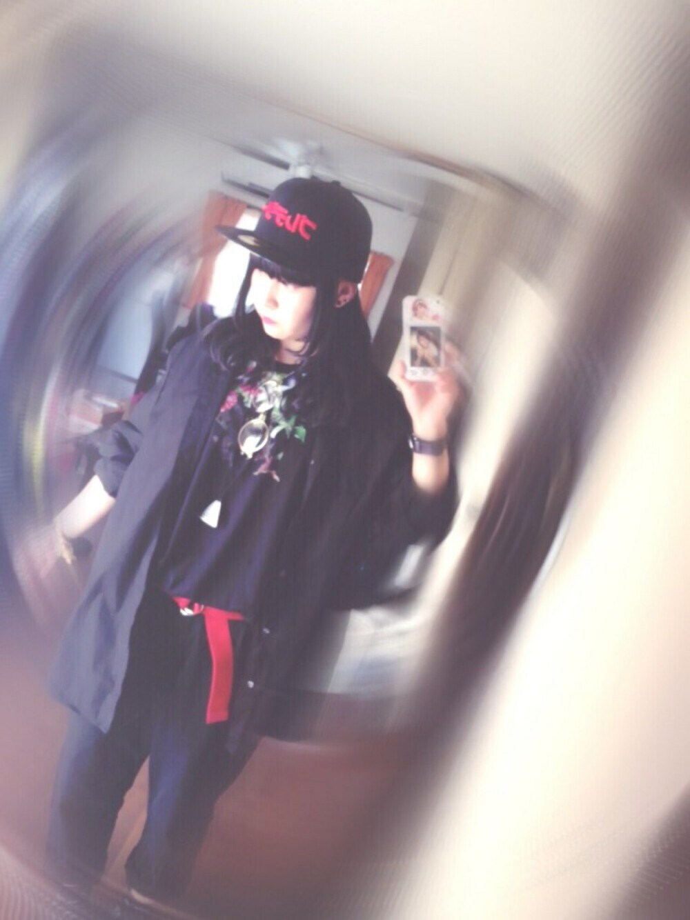 オールブラックでメンズシャツをオーバーサイズで上着として着てみました!キャップはプレデターです!TシャツはLEGENDA×Ry☆です!