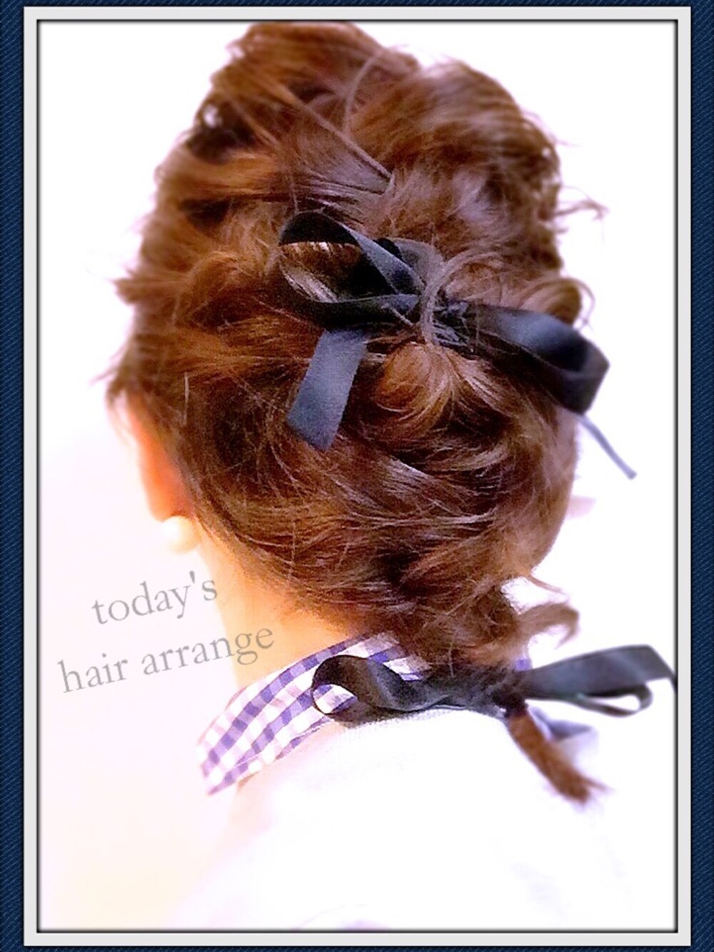 ヘアアレンジです!! 長さはミディアム 頭のてっぺんから後ろに向かって編み込みして一つ目のリボンの部分でまずゴムで留めます。 留めたところからまた下に向かって、編み込み〜三つ編みしていきます。 最後にまたゴムで留めます。 ゴムの所にリボンを結べば完成〜♪