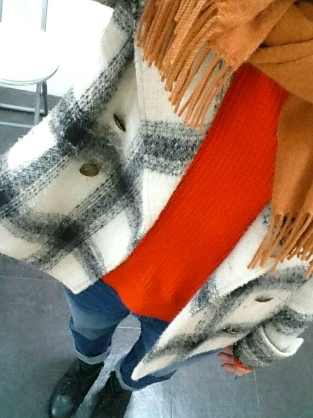 最近のマイブームゎマフラーを前でモコっと巻くこと。 グリーンのソックスが見えないな。。。