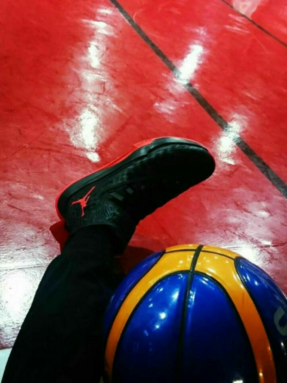 東大阪のNKS-405でバスケしたときのコーデです。 このジョーダンはセールで激安で買いました。足首のストラップが安定していていい感じです。 ジャンプマンのロゴとコートの色を合わせてみました笑 ストリートコートでやるときはボールもストリート用でプレーします。