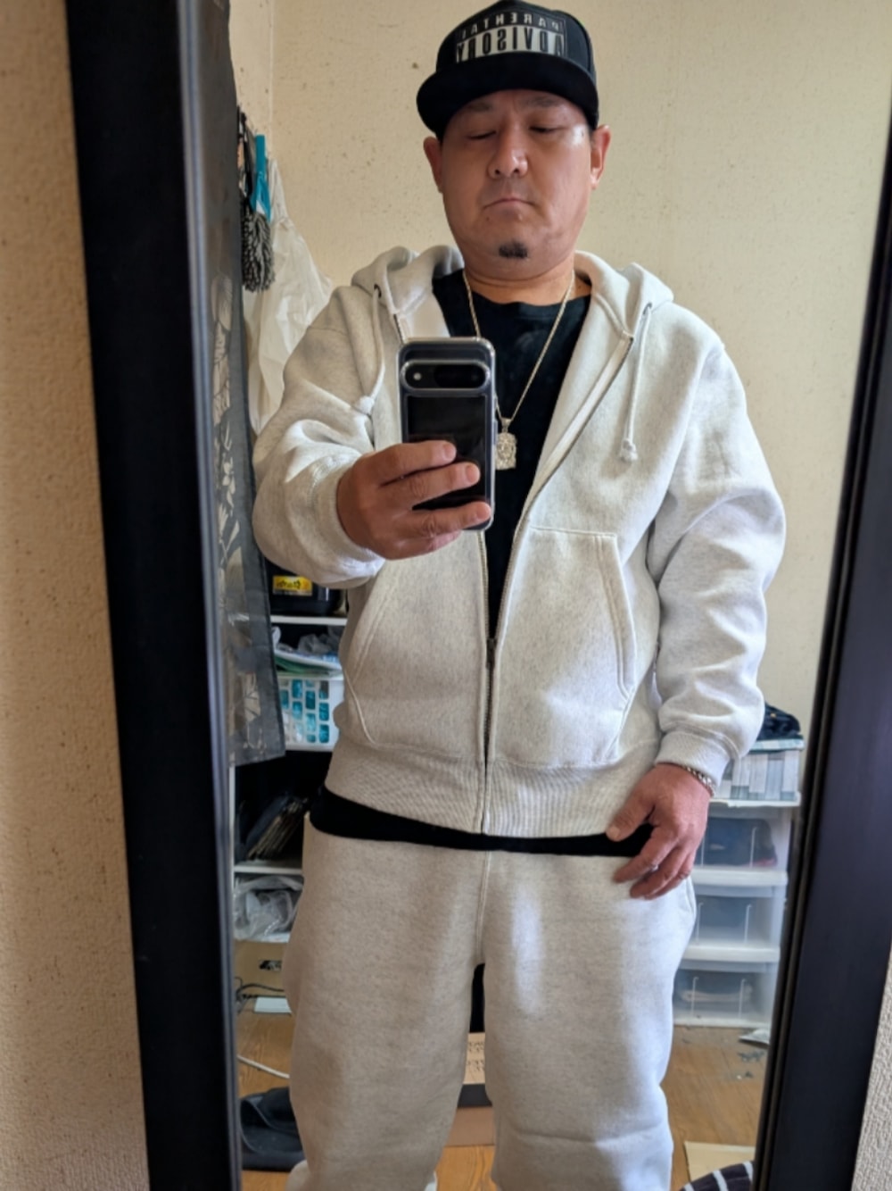 今日は雨で肌寒いのでヘビーウェイトのセットアップで手抜きコーデ。
