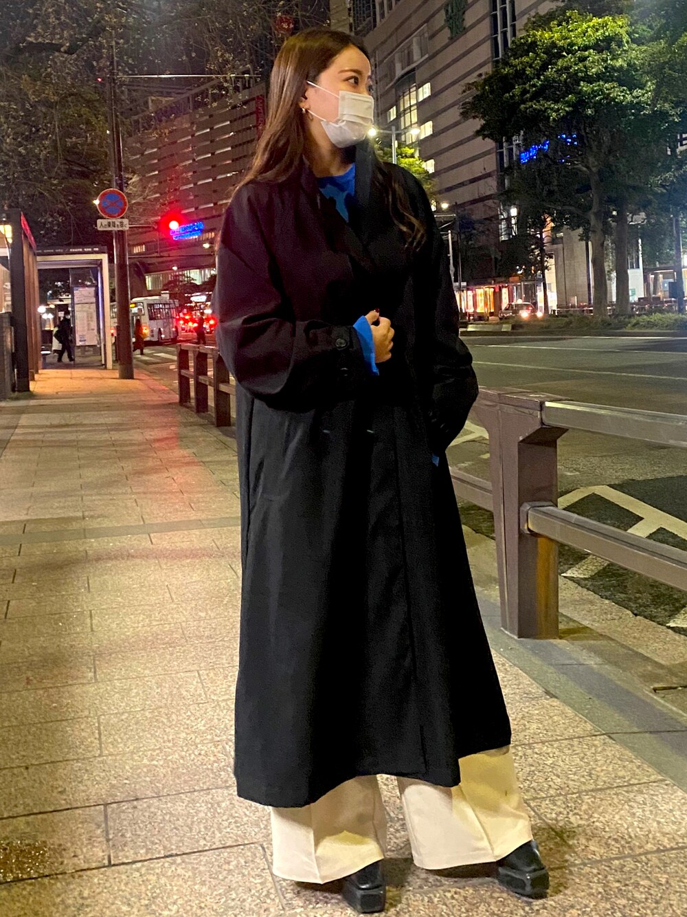ブラック系のトレンチコートを着用したレディースの冬コーディネートの1枚目の写真