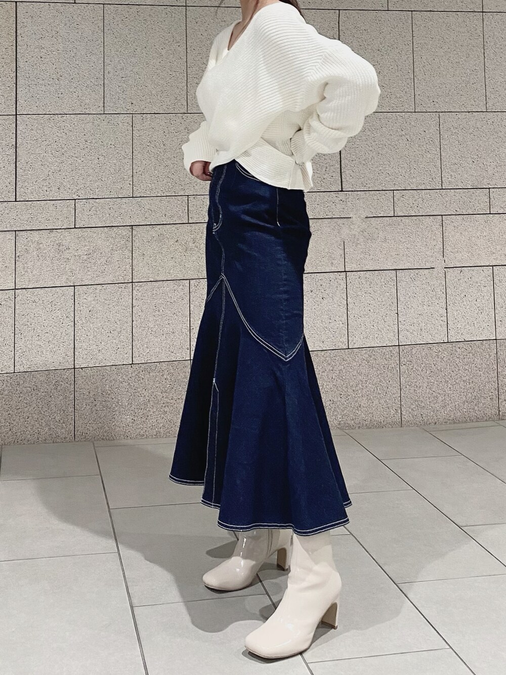 ホワイト系のトップスを着用したレディースの冬コーディネートの1枚目の写真