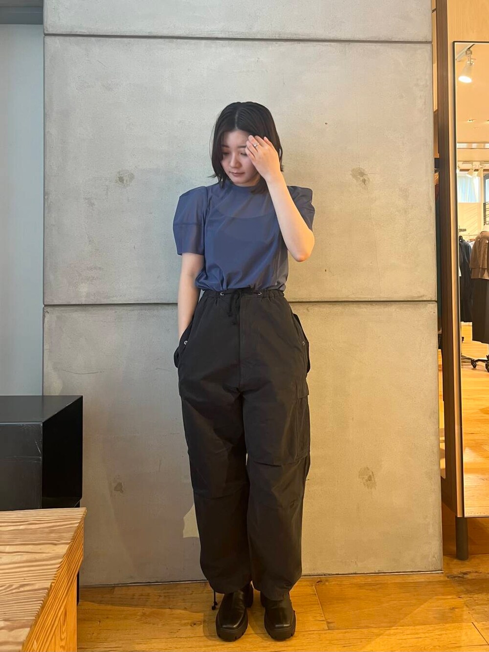 EKALのパラシュートパンツは履きやすくて楽ちんなのに可愛いのは最強ですよね!! トップスに女性らしさのあるトップスを合わせたことでカジュアルダウンしすぎないコーデにしてみました★