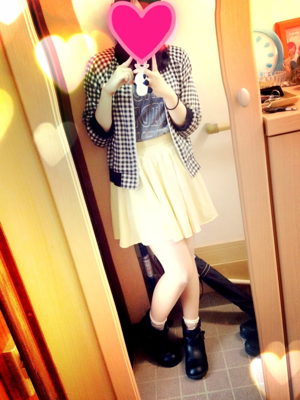 ギンガムチェックブルゾン 宇宙柄Tシャツ スカート ショートブーツ