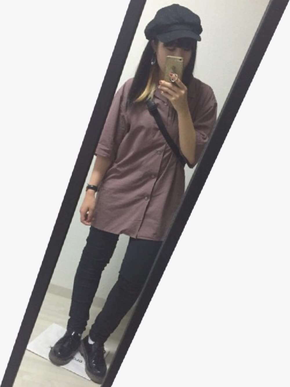 9/1 この間セールで買ったシャツ👚 くすみピンクが秋っぽいかな? ピアスもお気に入りでずっと着けてる