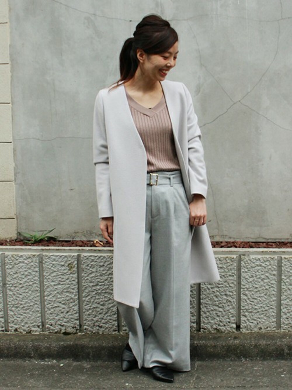 シンプルなシルエットと上質な素材でつくられたメルトン素材のコートです。 コーディネートしやすい丈感なので、同じ色合いのワイドパンツと合わせて上品なスタイリングに。