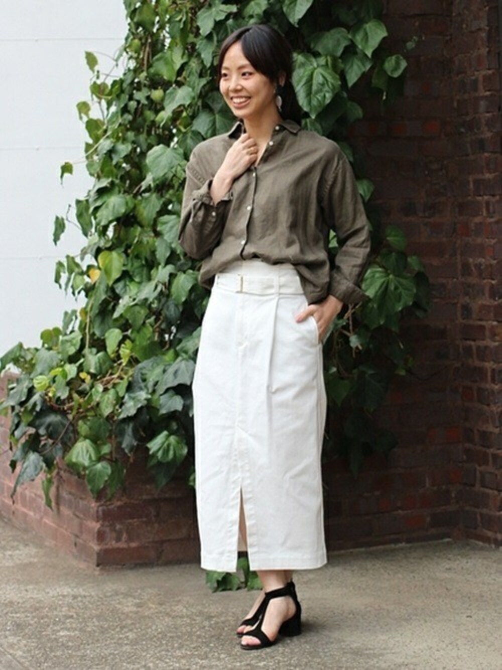 カーキは白ボトムで合わせて鮮度up。 定番シャツは大人カジュアルに着たい。