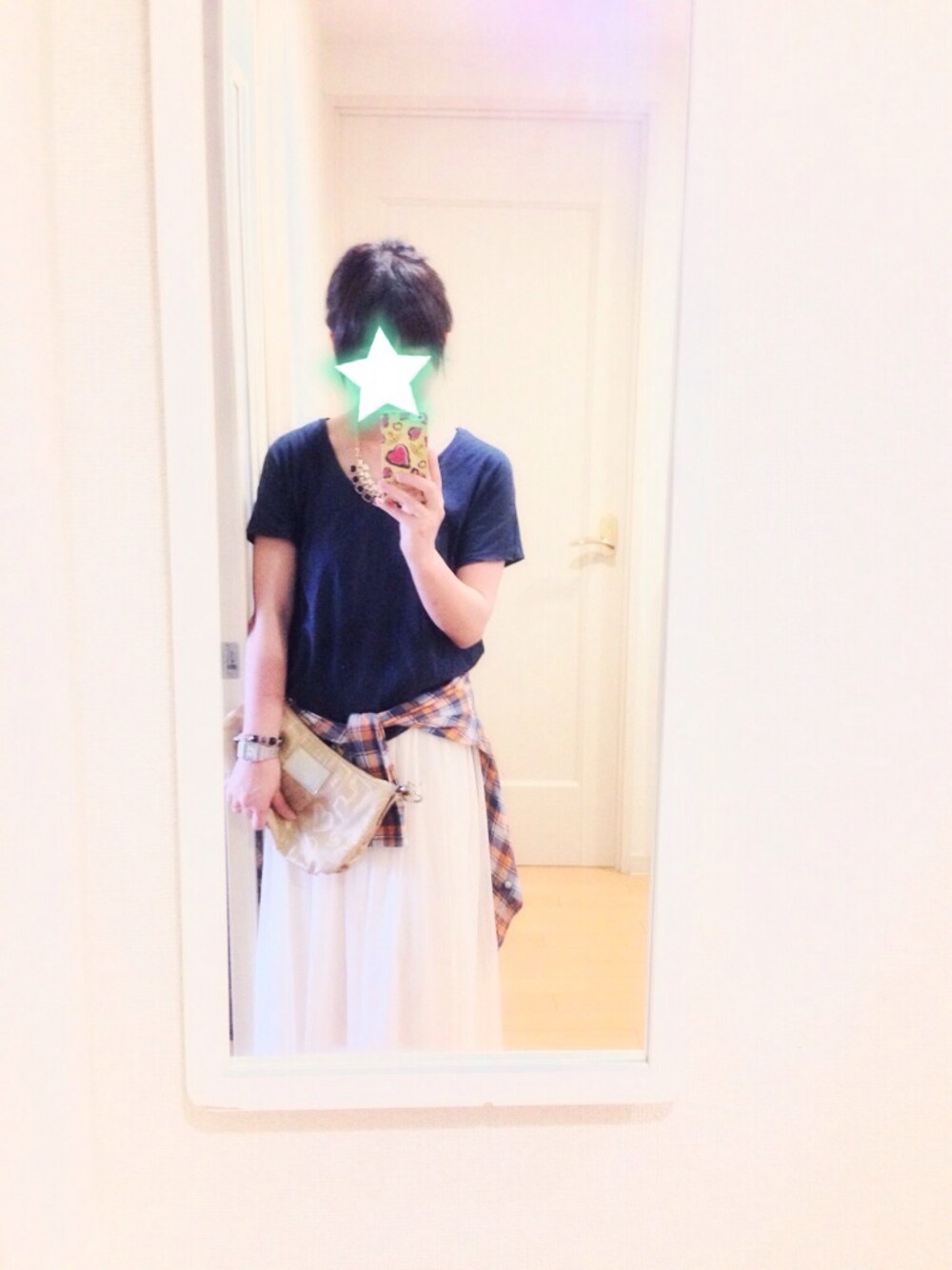 Tシャツ*UNIQLO チュールワンピ*しまむら チェックシャツ*UNIQLO 靴*ehwg 今日も暑い〜(;^_^A