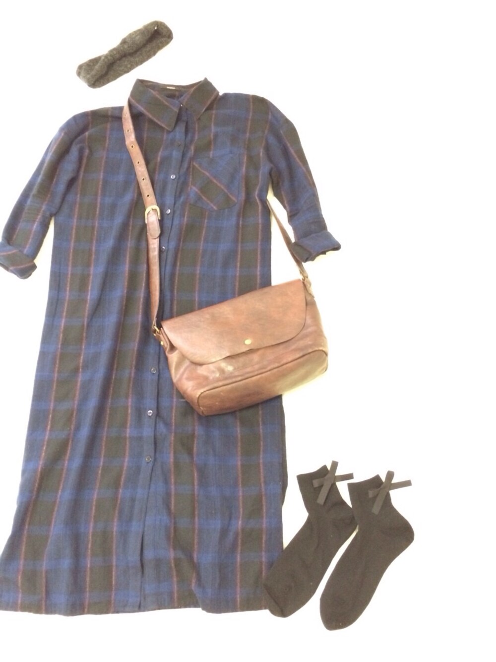 ブルー系のワンピース、ブラック系のソックス/靴下を着用したレディースの秋コーディネートの1枚目の写真