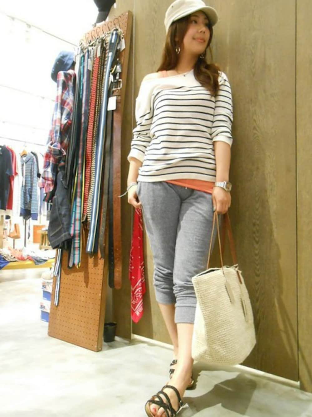 スウェットパンツをメインにリラックスマリンスタイル。 ニットソーを肩からずらしたり、パンツを裾リブを利用して膝下まで上げたりすれば肌面積も増えてルーズになり過ぎないコーディネートに。 差し色のタンクトップもオススメです。