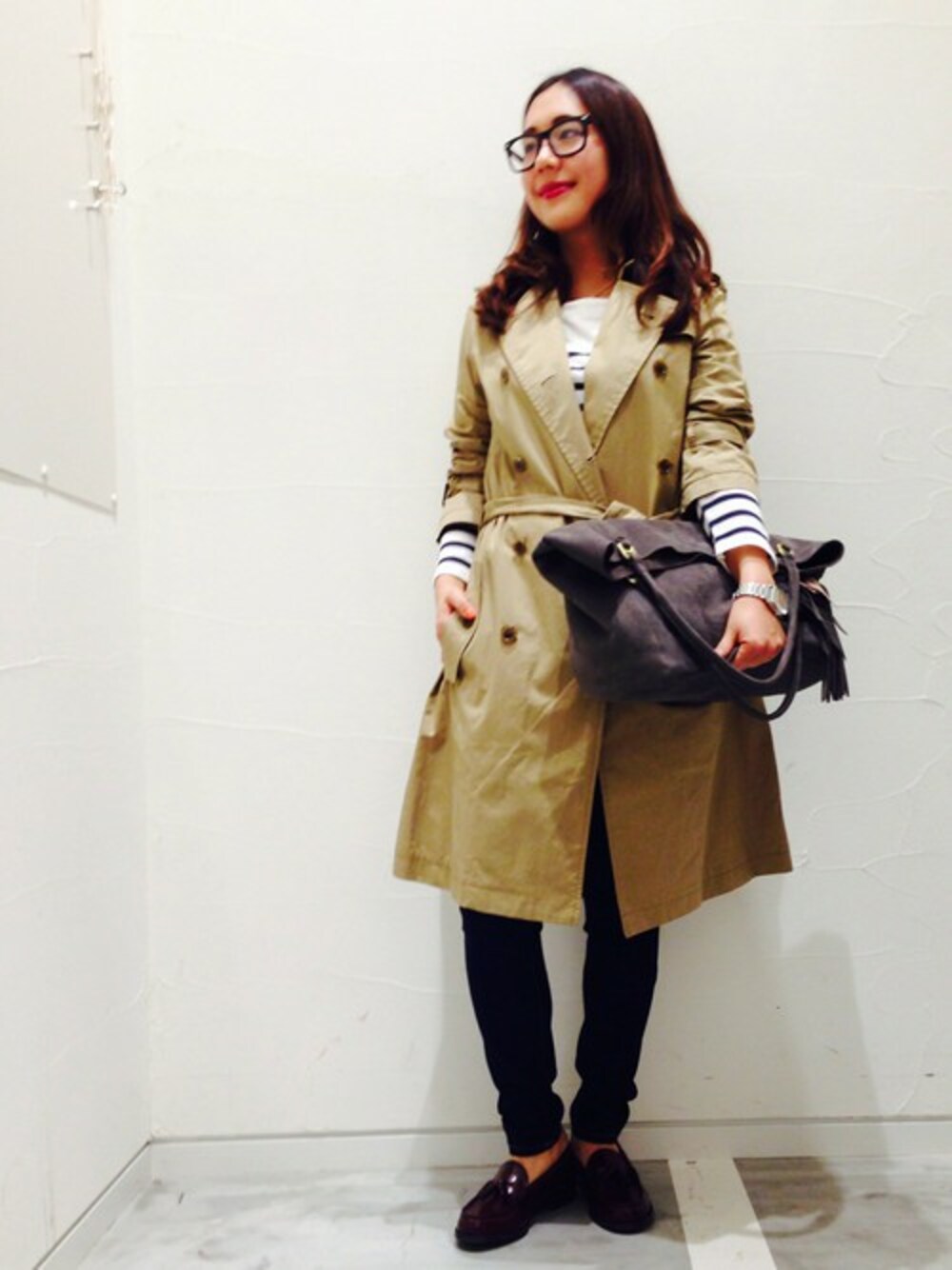 膝丈までありどんなシーンも頼れるトレンチコートを、ちょっとフレンチに着崩したカジュアルコーディネート!
