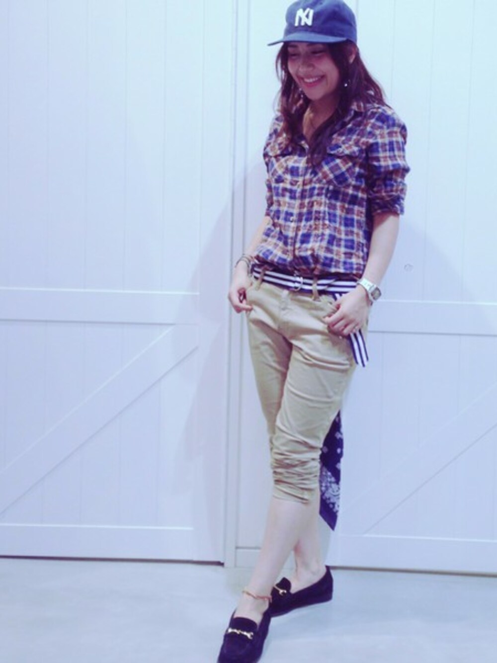 ベージュトーンでまとめた秋のトラッドスタイル。 メンズよりのスタイリングですが、細身シルエットのシャツを選び、チノを腰ばきにして膝下でぐしゃっとさせると、女性らしく着こなせます。