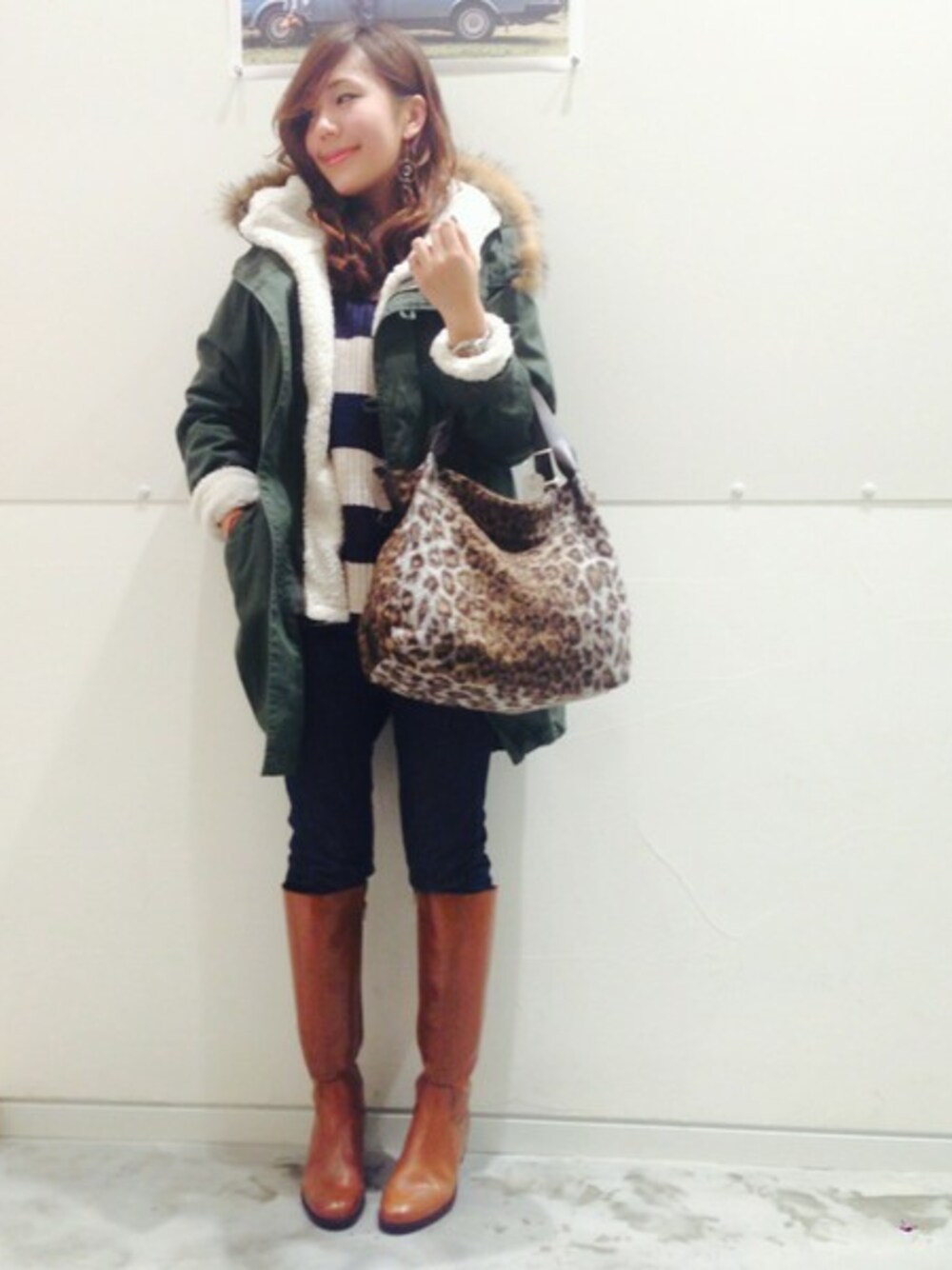 袖までリッチに取り外し可能なもこもこライナーがついたモッズコートをメインに。 ぜひ袖を折返して、もこもこと手首のコントラストを強調して着ることをオススメします! インナーはシンプルですが、リブ編みで表情のあるボーダーにデニム+ジョッキーブーツで。