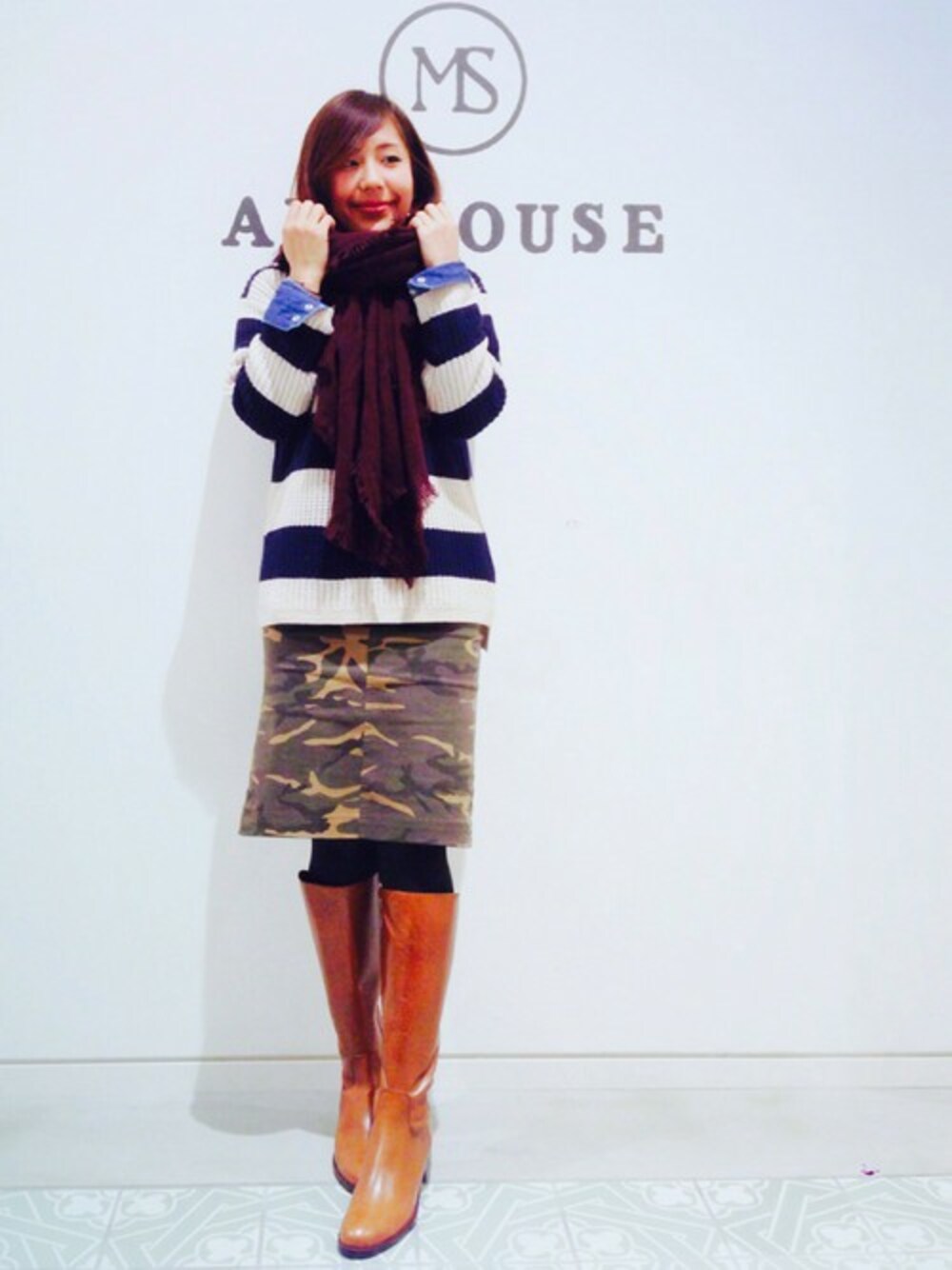 トレンドのカモフラージュ柄をタイトスカートで。 後ろウエストがゴムで、生地自体もストレッチ素材なので、シルエットはタイトですが楽ちんです! その分上は緩めシルエットのニットでメリハリを。