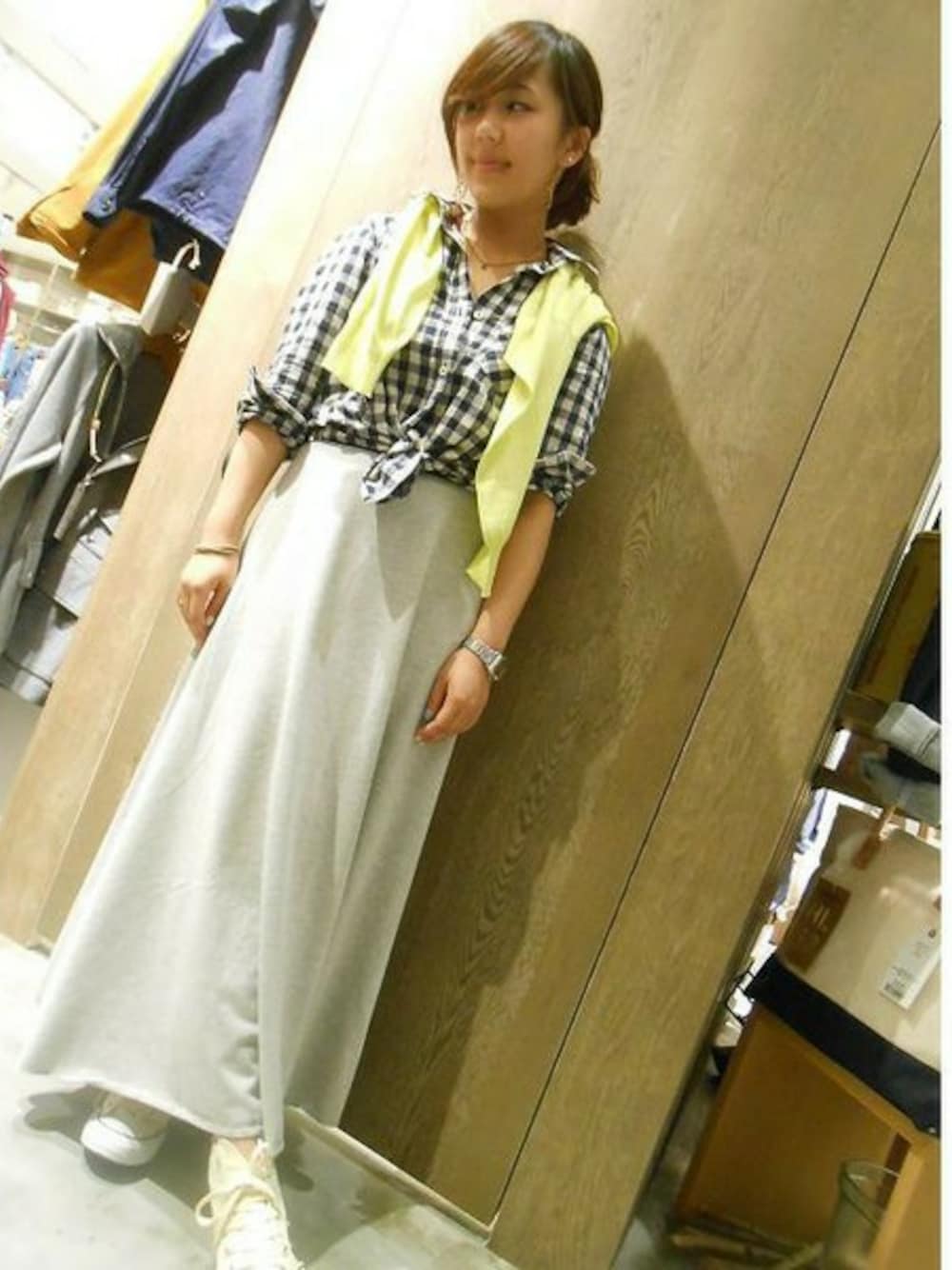ボリュームのあるスウェットマキシスカートをコーディネートするなら、 この春は大き目のギンガムチェックシャツを前裾で結びコンパクトに合わせるのが、オススメです。 差し色として、トレンドのネオンカラーのカーディガンを肩掛けすると、 スニーカーやフラットシューズでも、よりバランスを取りやすくなりますよ!