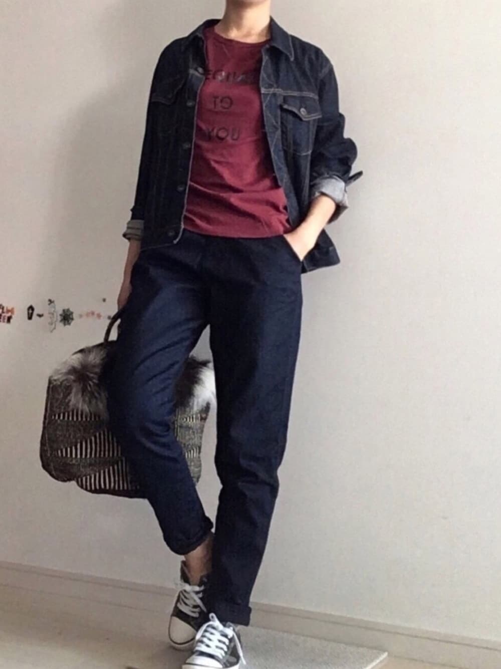 デニム×バーガンディー 10月なのに夏日ー! 日中はTシャツでいいくらいでしたね〜
