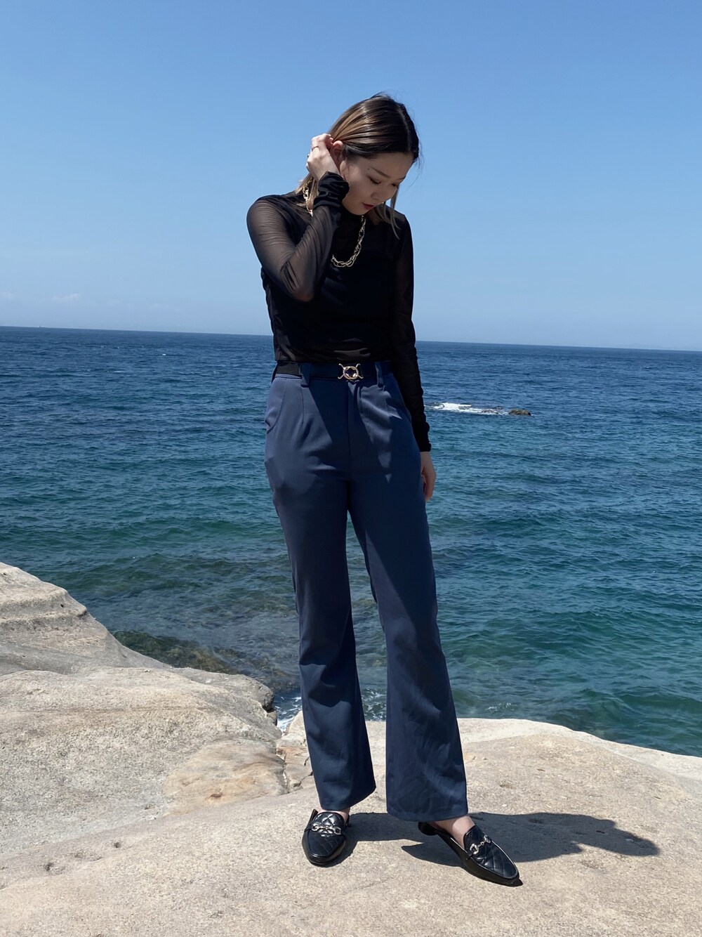 シアートップスの中には ブルーのショート丈キャミ💙 あえて青×青であわせたぁ!! 写真じゃ分かりずらいけどなぁ…