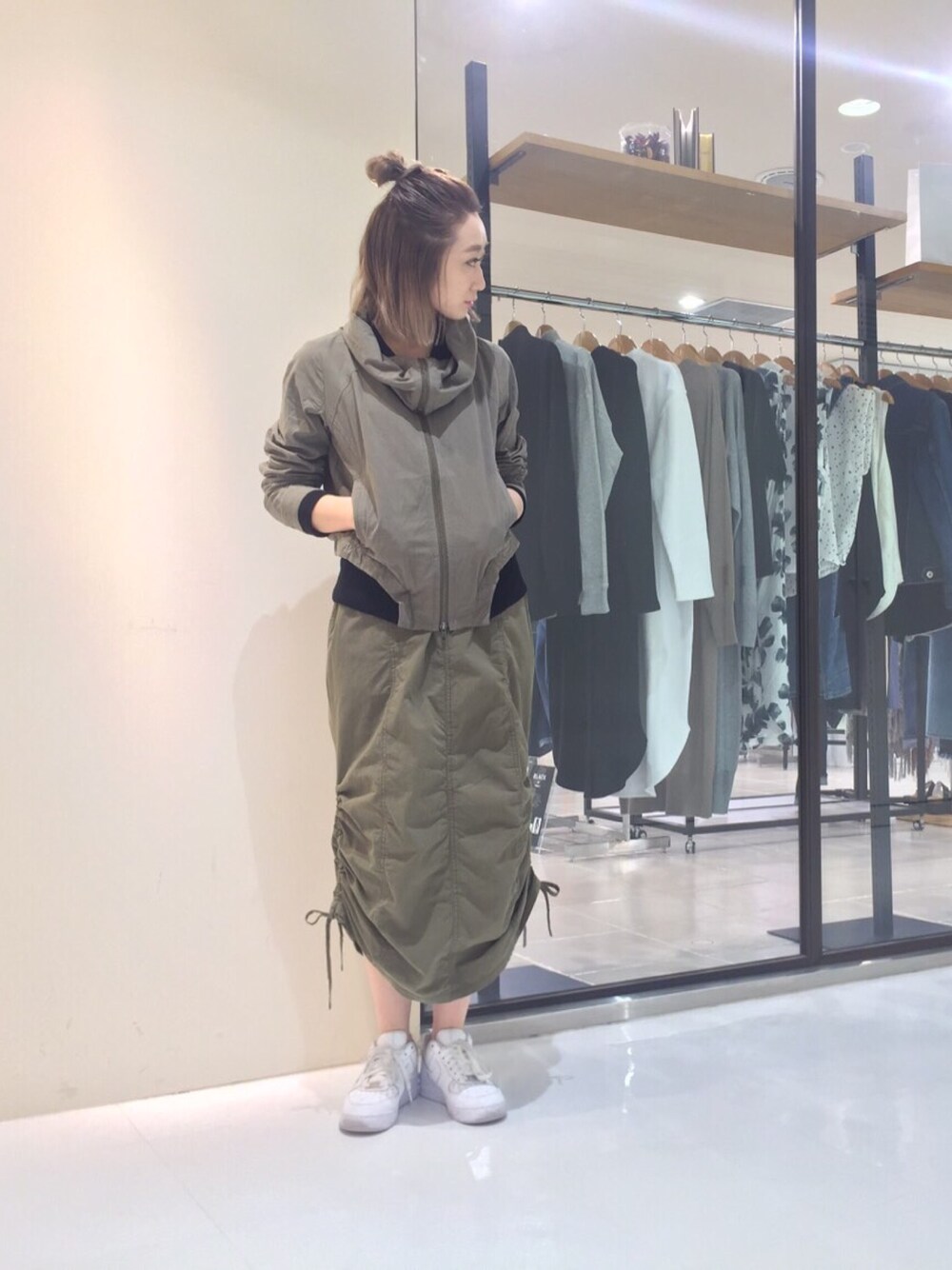ワーク系のブルゾンとスカートをセットアップ風に♪カーキでワントーンコーデ