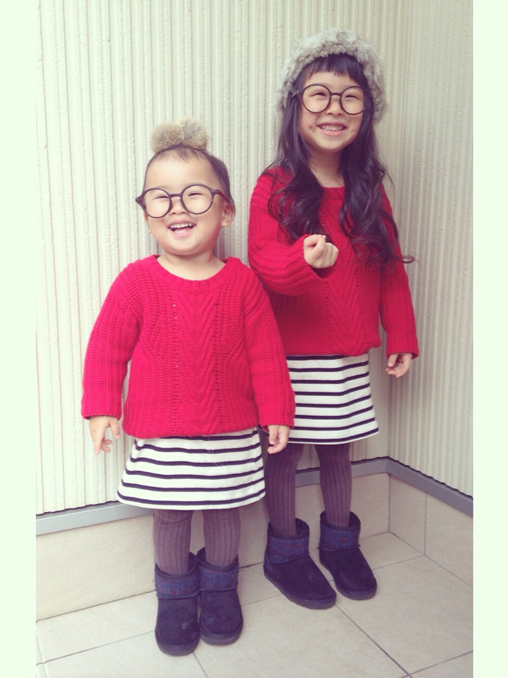 今日コーデ◡̈♥︎ お姉さんがボーダーワンピースを着る~~~!!!!っていうもんやから・・・・・ ほんならこれでどうだっ!!!!!!って赤セーターと合わせたぁ~~~(≧∇≦)/