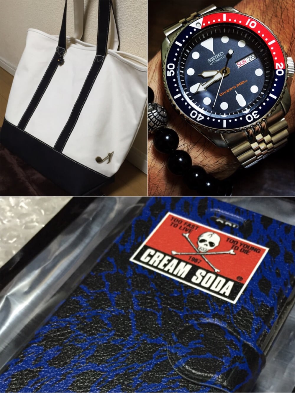 最近の買ったもの。SEIKOのネイビーボーイとGUのキャンバストートは安くてもタフ。 クリームソーダのiPhoneケースは二十歳の頃に使ってた財布を思い出してつい衝動買い。