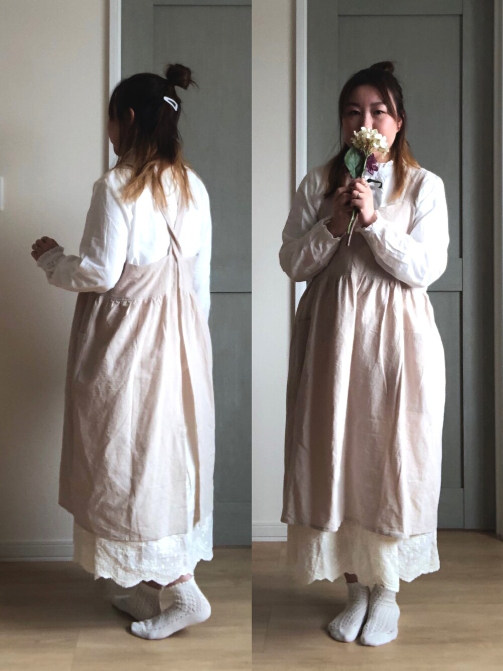 今日はホワイトコーデ‼️ エプロンワンピース着ました😄 後ろ頭が黒過ぎてヤバい‼️ しかもエプロンねじれてた😄 今日のピックアップタグ、ホワイトコーデはしたかったのでたのしみにしていましたー ネイルと同じ系の色だったから花持ちました、ネイルみえないけどー💅