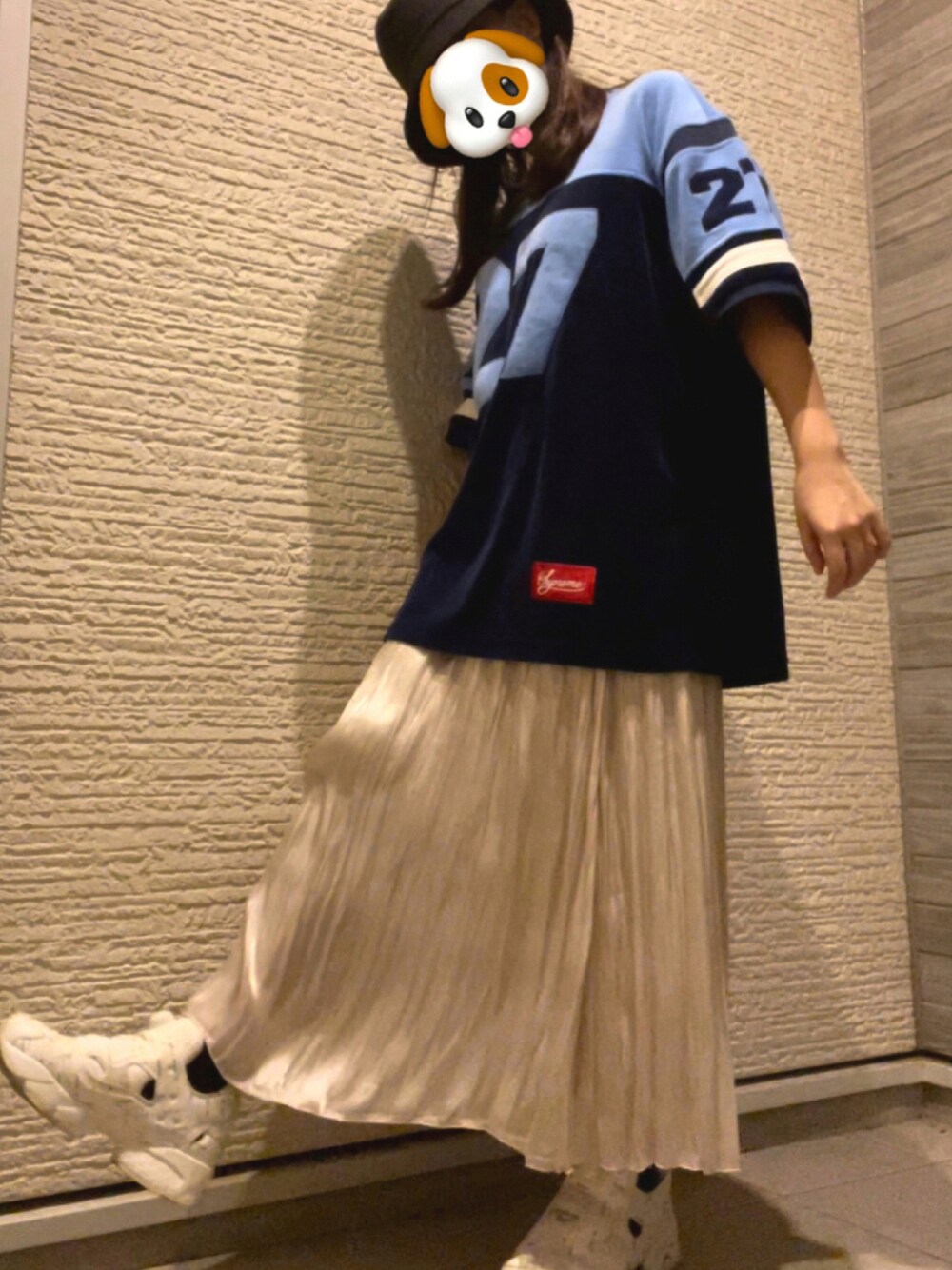 お散歩あとに🐶🐾 トップスは叔父からの貰い物🦕 素材がモコモコで可愛いんだけど ここ1ヶ月くらいしか着れなそう🥲 メンズTシャツとコーデ組むのって難しい🌀