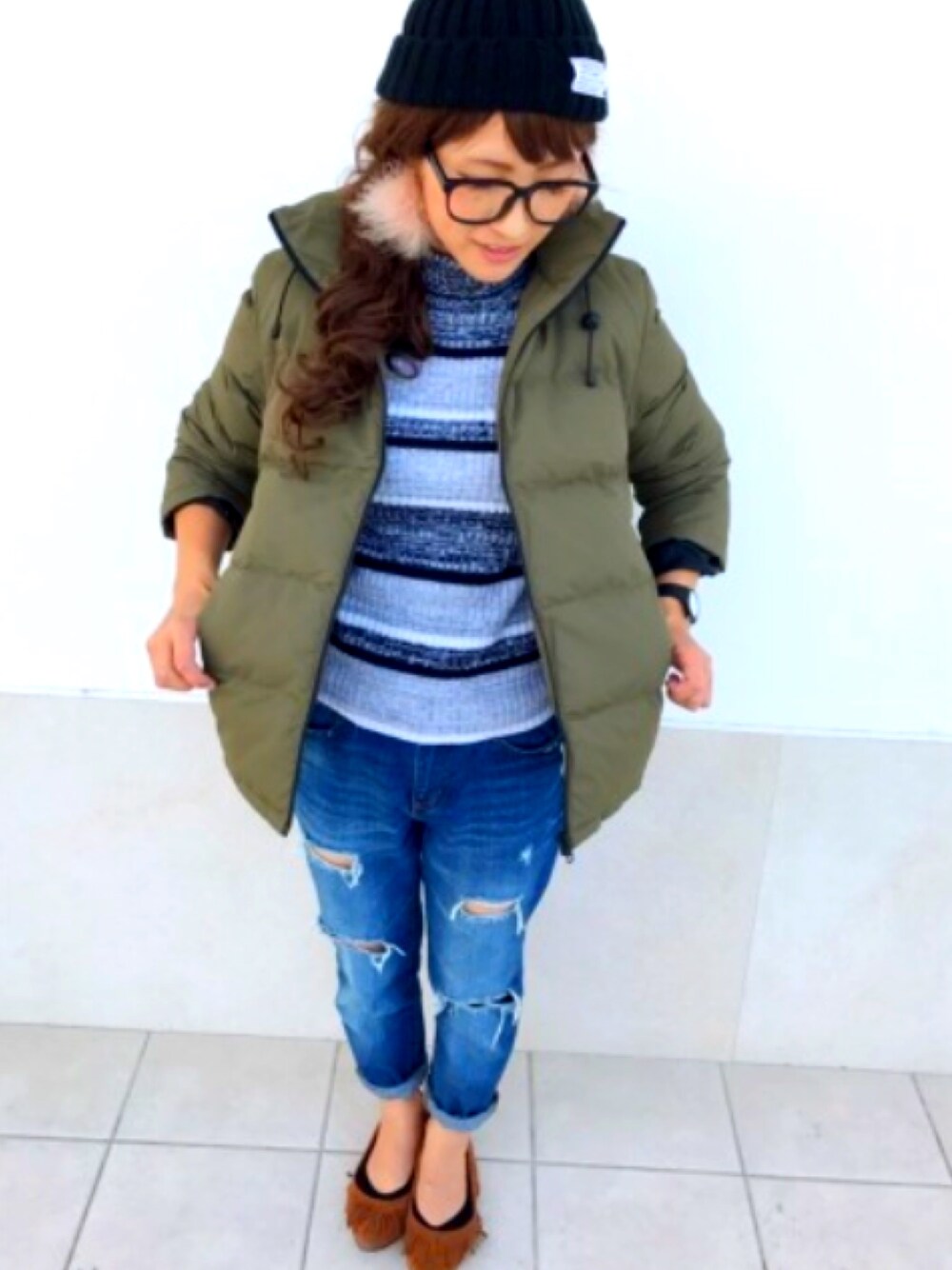 全身ジーユー。 このダウンめっちゃ着心地よくて あったかい‼️ ピアスは作ってみたよ。